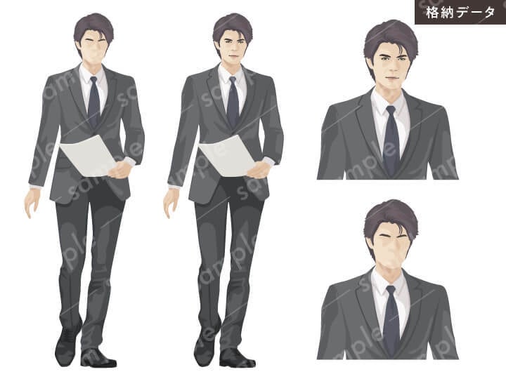 スーツを着たサラリーマン男性(正面)の全身立ち絵イラストが入っています。表情が入ったバージョンと、眉毛のみの表情なしの2種類入っています。