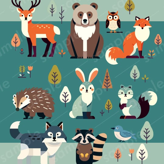 【森の動物】狐・鹿・熊・鳥・狼・うさぎ・リス・ハリネズミ・アライグマのベクターイラスト【aiデータ】